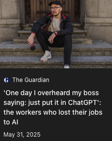 - Human creatives are facing real displacement—like UK copywriter Annabel Beales, who lost her job when her employer switched entirely to ChatGPT for blog content (The Guardian).